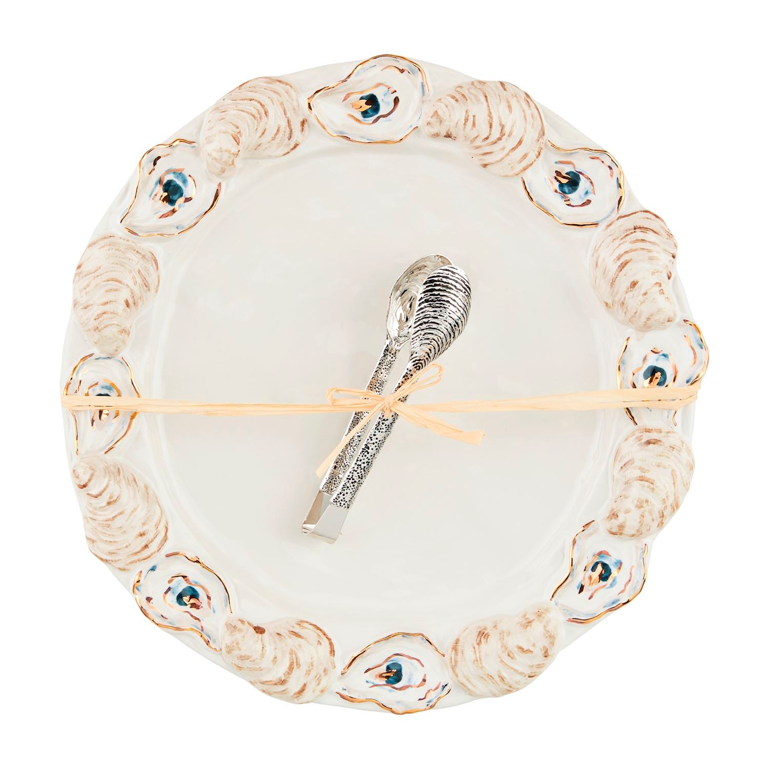 2-piece set. Stoneware platter features layered stoneware oyster shell rim. Comes with stainless steel oyster tongs.